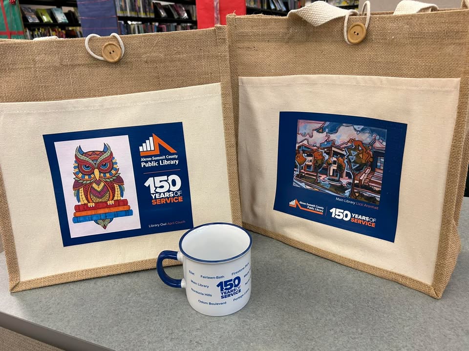 The Akron-Summit County Public Library in Akron, Ohio, is marking its 150th anniversary with special merchandise available for purchase. To commemorate this milestone, the library is offering limited-edition tote bags for $15 and mugs for $10.