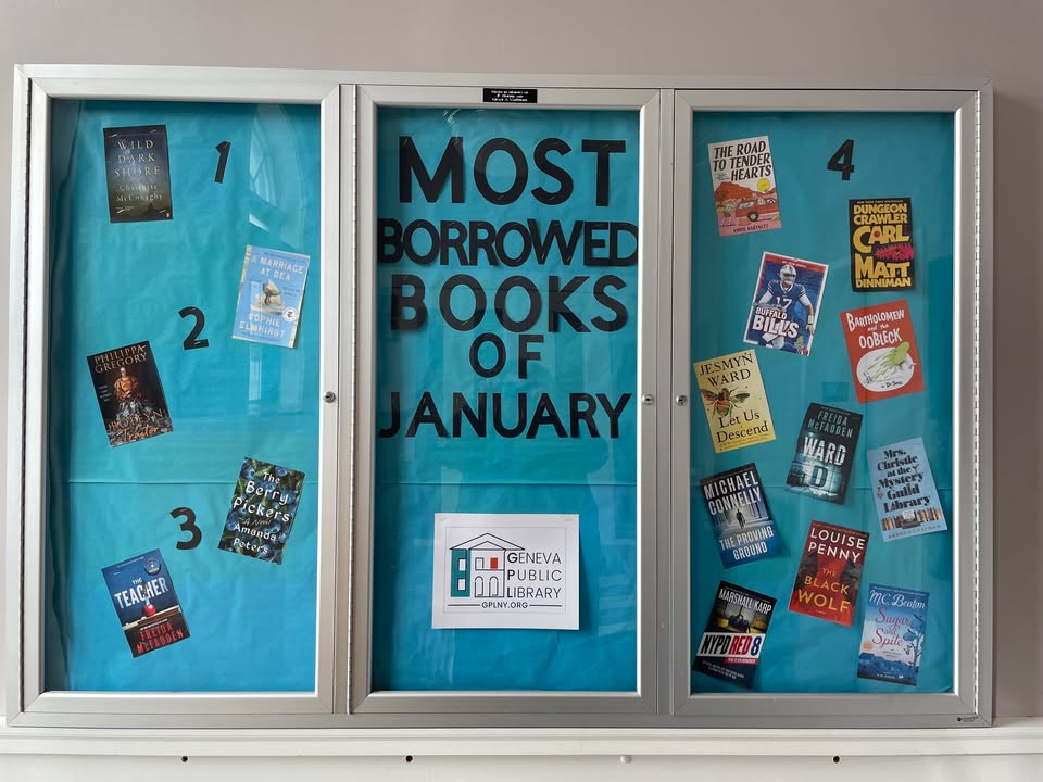 Geneva Public Library reveals January's top borrowed books with full cover display.