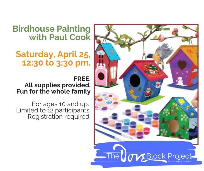 GENEVA, N.Y. — A free birdhouse-painting event with Paul Cook is set for Saturday, April 25, from 12:30 p.m. to 3:30 p.m. at The Dov Block Project in Geneva, for ages 10 and up, limited to 12 participants, with registration required at https://doveblockeventregistration.org/reserve.php?id=BZRS74.
