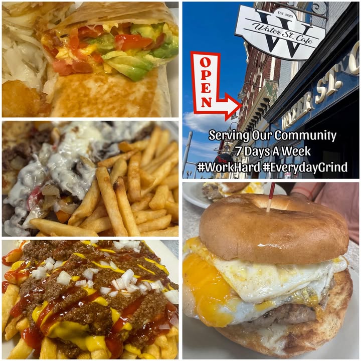 Water St. Cafe in Geneva, N.Y., says it is open seven days a week and offers burgers or breakfast burritos, according to a social media post.