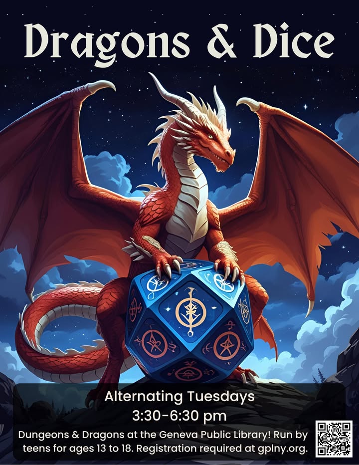 Geneva Public Library in Geneva, N.Y., hosts regular game meetups featuring Euchre, chess, American Mahjong and Dungeons & Dragons, with upcoming programs including Euchre Club on Mondays at 1 p.m., American Mahjong on Thursdays at 2:30 p.m. in the Reading Room, Can You Save the King? Chess Night with Marino on Thursdays from 5 to 7 p.m., and Dungeons & Dragons One Shots on Saturdays from 10 a.m. to 1 p.m. for grades 8 through adult (registration required for D&D; registration appreciated for Euchre).