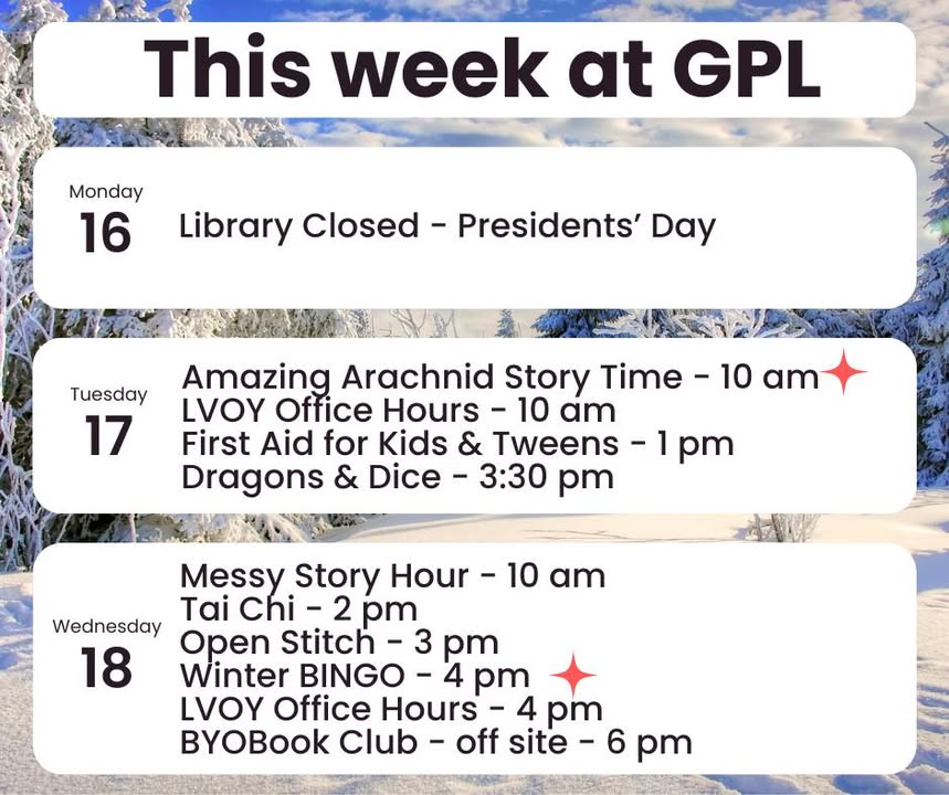 Geneva Public Library in Geneva, New York, announced a winter-break lineup of programs for kids and families—from BINGO and painting to first-aid sessions—with events this week including Amazing Arachnid Story Time, Dragons and Dice, Messy Story Hour, Tai Chi and Winter BINGO, plus LVOY office hours and a BYO Book Club off site, and the library will be closed Monday for Presidents' Day.
