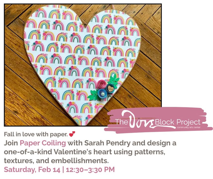 GENEVA, N.Y. — The Dove Block Project will host Paper Coiling with Sarah Pendry on Saturday, Feb. 14, from 12:30 to 3:30 p.m., at The Dove Block Project, a community arts center, for ages 13 and up, limited to 15 participants, with all materials provided and registration required at https://doveblockeventregistration.org/reserve.php?id=DECP63 to decorate a wooden heart with scrapbook paper, Mod Podge and embellishments.