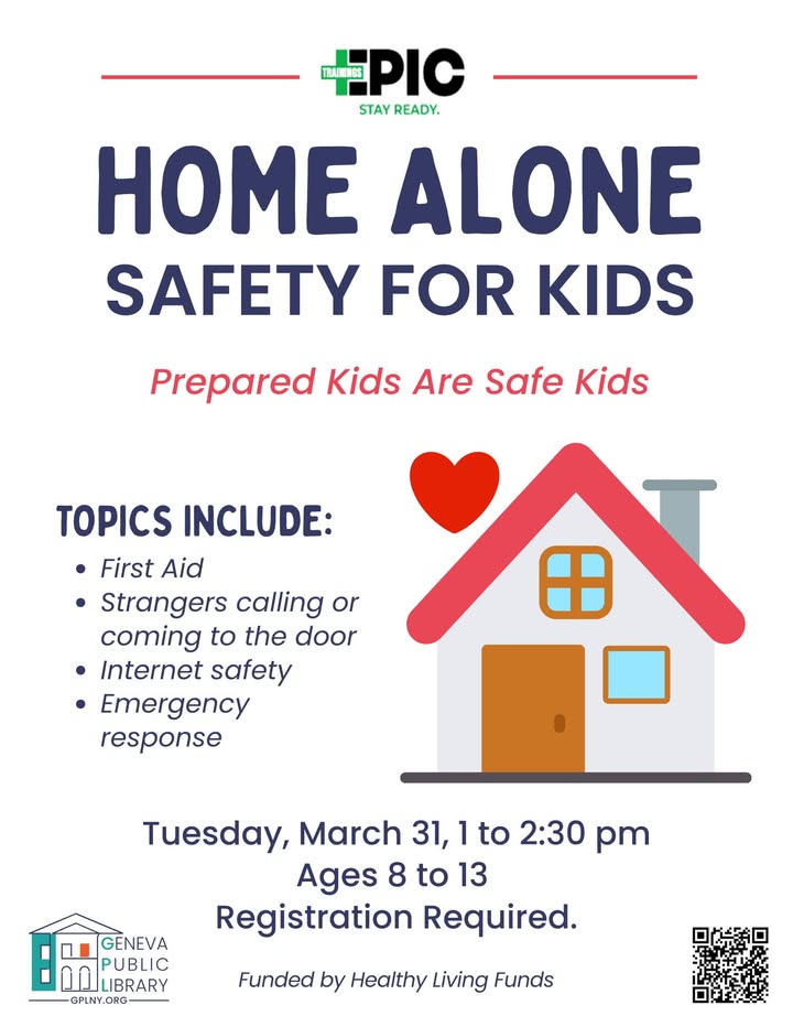 Geneva Public Library in Geneva, New York, will host a Home Alone Safety class on Tuesday, March 31, from 1 to 2:30 p.m., with Epic Trainings, for students in grades 3–8 (ages 8–13) to learn first aid, internet safety, how to handle strangers and what to do in emergencies, with registration at gplny.org.