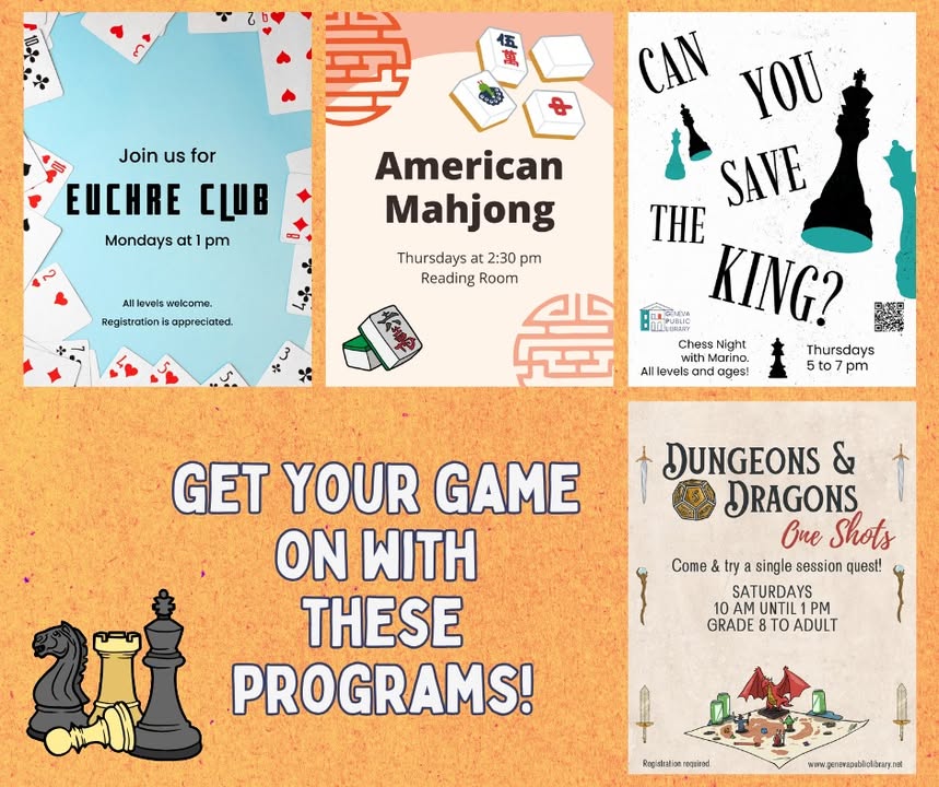 Geneva Public Library in Geneva, N.Y., hosts regular game meetups featuring Euchre, chess, American Mahjong and Dungeons & Dragons, with upcoming programs including Euchre Club on Mondays at 1 p.m., American Mahjong on Thursdays at 2:30 p.m. in the Reading Room, Can You Save the King? Chess Night with Marino on Thursdays from 5 to 7 p.m., and Dungeons & Dragons One Shots on Saturdays from 10 a.m. to 1 p.m. for grades 8 through adult (registration required for D&D; registration appreciated for Euchre).