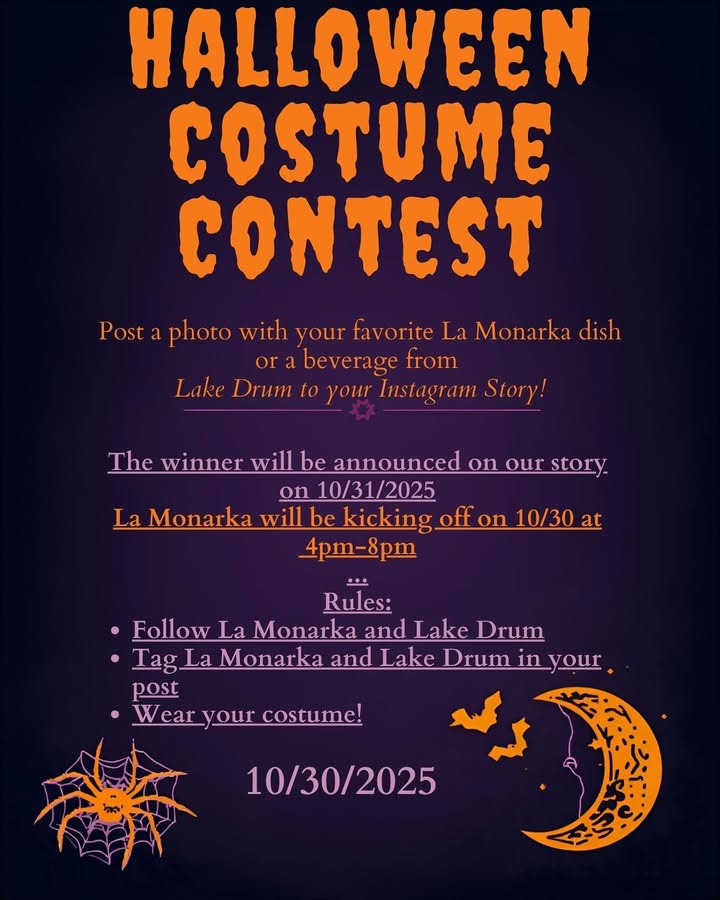 Lake Drum Brewing in Geneva, NY, is hosting a Halloween costume contest in partnership with La Monarka. The event takes place on October 30, 2025, from 4 p.m. to 8 p.m. Participants are encouraged to wear their best costumes and post an Instagram photo featuring their look or a favorite La Monarka dish or beverage from Lake Drum. For entry, individuals must follow both La Monarka and Lake Drum Brewing on Instagram and tag both pages in their post. The winner will be announced on Instagram Stories on October 31, 2025.