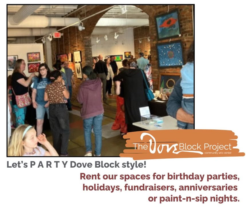 The Dove Block Project in Geneva is inviting people to plan and celebrate events at their community arts center. They offer spaces that can be rented for birthday parties, holidays, fundraisers, anniversaries, and paint-n-sip nights. For booking information or to learn more about renting the space, interested parties can call 315-325-8160 or email info@thedoveblockproject.org.