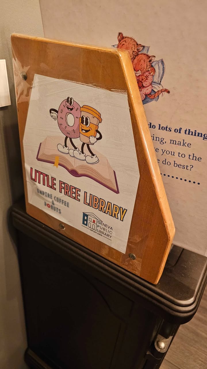 Empire Coffee & Donuts in Geneva, NY, recently hosted the Geneva Public Library’s monthly BYO Book Club. The coffee shop has also agreed to house a new Little Free Library. According to a report from the library, Susie installed the Little Free Library last night. Several books have already been taken by new readers from the installation. The Geneva Public Library and Empire Coffee & Donuts continue to support community efforts through these initiatives.