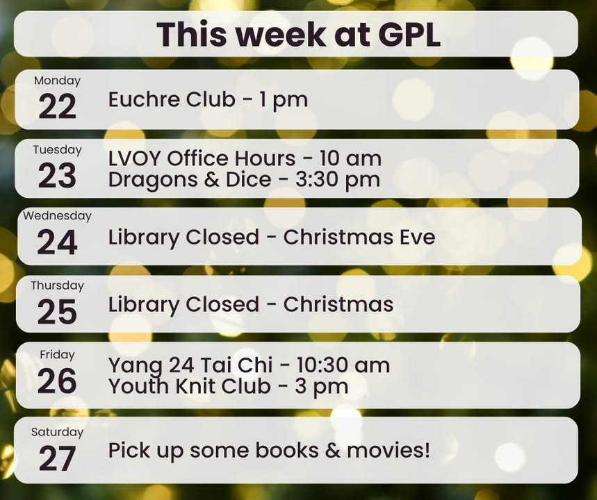 • Friday, December 26: Yang 24 Tai Chi at 10:30 a.m. and Youth Knit Club at 3:00 p.m.