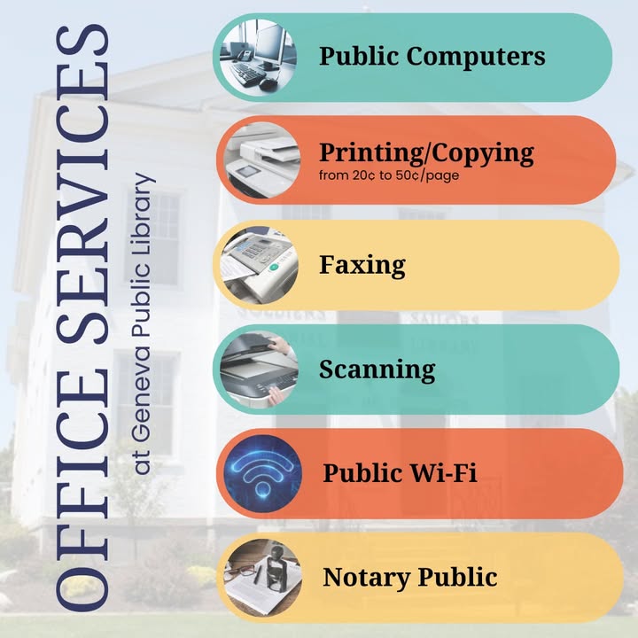 Geneva Public Library provides office, digital, and notary services to visitors.