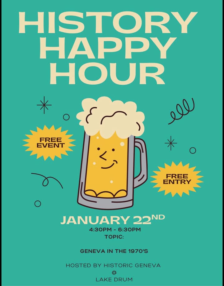 Lake Drum Brewing in Geneva, NY will host a History Happy Hour on January 22nd from 4:30 p.m. to 6:30 p.m. The event, presented in cooperation with Historic Geneva and hosted by John Marks, will focus on life in Geneva during the 1970s, covering topics from local culture to community life. Entry to the event is free. Attendees are encouraged to arrive early to enjoy a pint and learn about the city's history.