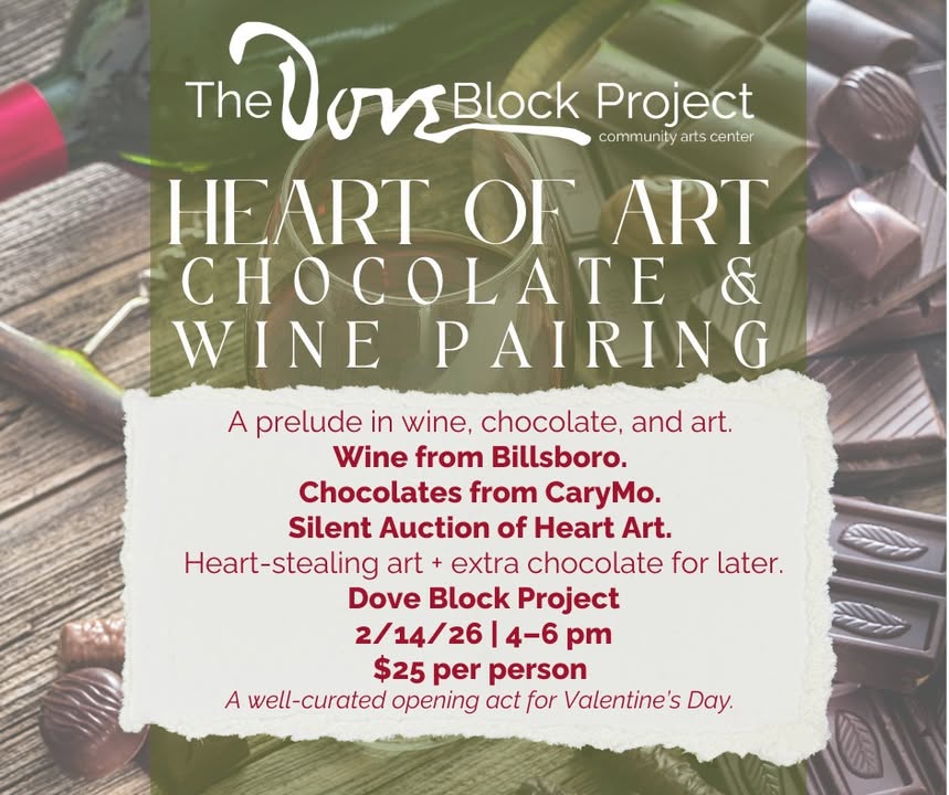 On Saturday, February 14, from 4 to 6 p.m., the Dove Block Project in Geneva, New York, will host the Heart of Art: Chocolate & Wine Pairing. Attendees will enjoy heart-themed artwork showcased in a community art exhibit alongside a silent auction. Wine will be provided by Billsboro Winery, and chocolates are supplied by CaryMo.