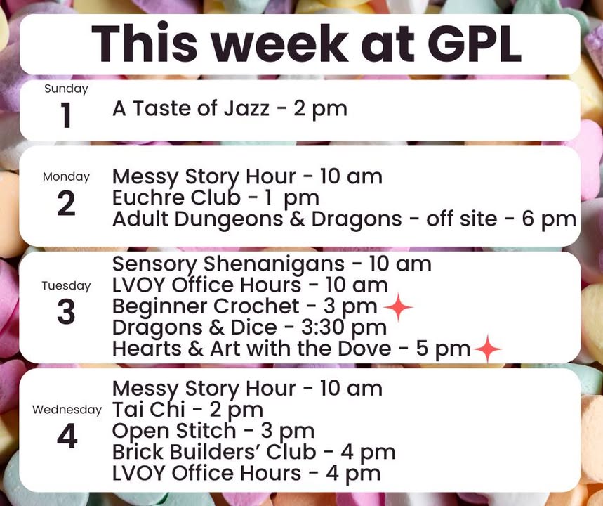 Geneva Public Library hosts heart-themed button crafting sessions; registration required.