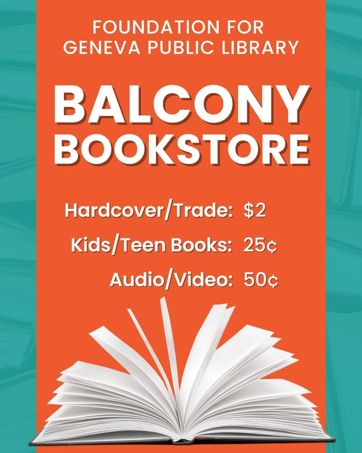 The Geneva Public Library reports that the Balcony Book Store is open year‐round on the second floor of the building. The store offers a selection of used books and media with fixed pricing. Hardcover and trade books are available for $2, kids and teen books are 25¢, and audio and video materials are priced at 50¢. Proceeds from sales support the library. New titles are added regularly, inviting visitors to browse for their next read or to find a hidden gem.