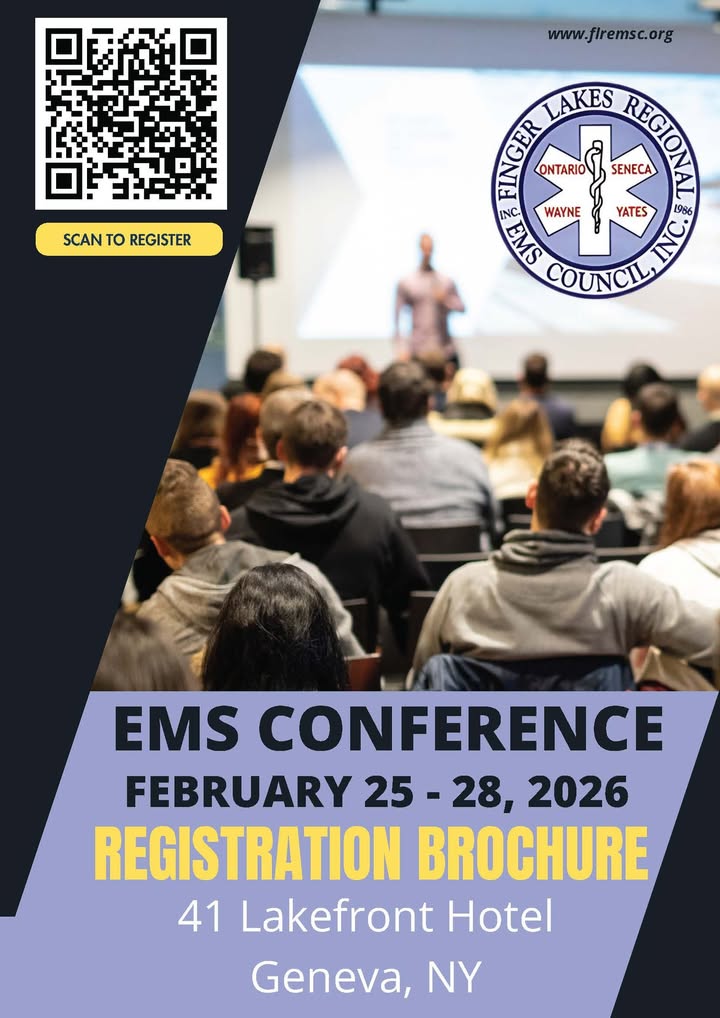 The EMS Conference will be held from February 25 to February 28, 2026, at the 41 Lakefront Hotel in Geneva, NY. The event will feature a lineup of speakers, networking opportunities, and time for regional EMS providers to connect. Additional registration details are available through the official registration brochure at www.flremsc.org.