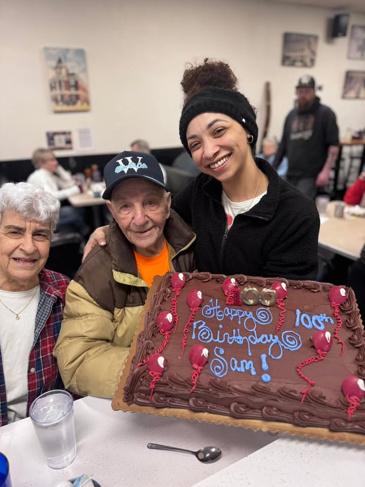 Sammy Ferugia, a World War II veteran from Geneva, N.Y., who served in the U.S. Army with General George S. Patton, turned 100 this morning at Water St. Cafe in Geneva. He was showered with love and scratch-off tickets, his favorites, at his favorite stool at the cafe counter. Staff members said it is an honor to celebrate his birthday, but that they celebrate Sammy every day. Ferugia's quick-witted humor and his twinkle in his eye were noted by staff and customers, who said he is adored by all. Lifelong friend Josephine Perry helped get Sammy to the Diner safely this morning and for buying this beautiful cake.