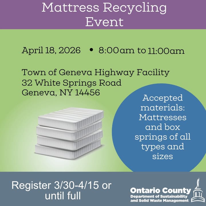 Ontario County will host a mattress recycling event at the Town of Geneva Highway Facility on April 18, 2026.